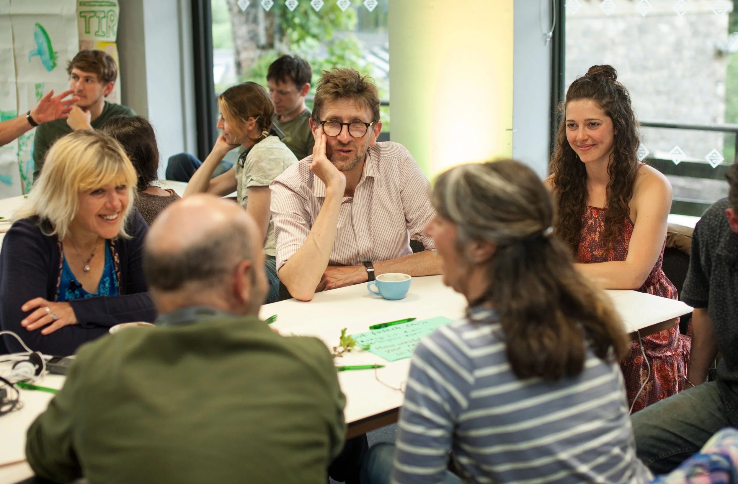 With Andrew Simms and Ignasi Torrent, who explored some inspiring examples of urgent and hopeful projects and approaches around the world, and performances from Rob Spaull and Charles Gershom of Accretion Entropy. Room layout: Long ‘feast’ type tables. Walls ‘decorated’ with output of Ysgol Dyffryn Ogwen school’s 'hope’ discussions